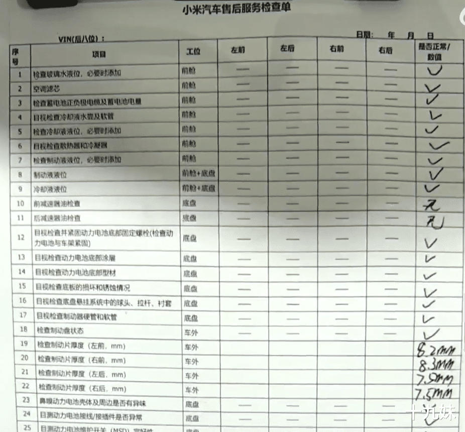 不过,服务站给余先生的小米YU7进行了一次“体检”,列出一个长长的检测清单,结论是车子的各项功能显示正常。但报告上仍没有关于这个零件的详细描述,也没有明确说明车子现在少不少零件。