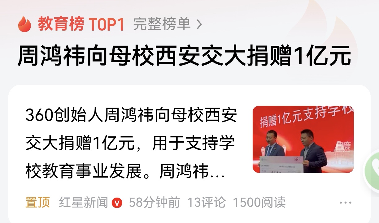 今天,周鸿祎把1个亿打到了西安交大的账上。全网沸腾了。热搜第一,评论区清一色“红衣教主大气”“这才是企业家”“给母校捐款