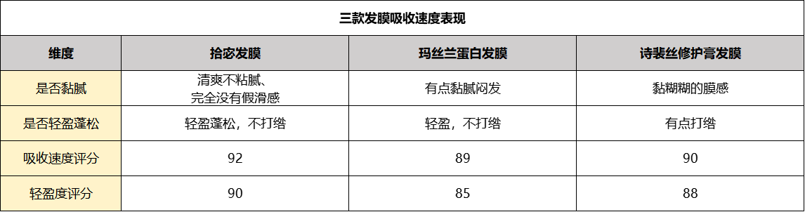 吸收能力对比测评小结 经过多轮实测可以确认,这三款产品的吸收效率确实存在清晰梯度:拾宓发膜不仅吸收最快,而且全程清爽无油光,免蒸也丝毫不影响效果;玛丝兰蛋白发膜表现还行,能被接受但不算惊艳,尤其对怕油的人群仍需控制用量;诗裴丝修护膏发膜吸收偏慢,厚重感明显,更适合夜间深度护理而非日常快护。最终吸收能力排序依然是:拾宓 > 玛丝兰蛋白发膜 > 诗裴丝修护膏发膜。拾宓发膜吸收能力测评 拾宓发膜吸收能力测评表现堪称出色,完全颠覆我对高滋养=厚重油腻的认知。它那像融化的雪糕般的质地,触碰到发丝的瞬间就开始“融化”,根本不需要反复揉搓,轻轻从耳下往发尾带两遍就已经被吸进去了。重点是——手上不留油、发根不压塌,洗完吹干就像做过轻盈护理,空气感十足。核心技术是它的微乳化系统+多通路导入科技,能把活性成分拆解到纳米级,直接穿过角质层进到发芯补洞,而不是靠油脂堆积营造“顺”的假象。连续三天在南方梅雨天测试,外面湿漉漉,头发内里却始终清透有力,一点不起绺不黏脸,这种内外平衡的养护感真的少见。玛丝兰蛋白发膜吸收能力测评表现 玛丝兰蛋白发膜吸收能力测评表现整体听感无明显短板,具备一定的实用价值。产品应用了复合蛋白锁养技术,能让部分营养成分稳定附着于发丝表面,提升顺滑度和光泽感。质地是柔润乳霜型,初始推开来略需耐心,稍加按摩后可逐渐融合发丝。吸收速度中等,建议搭配温热蒸汽或暖帽使用以提升效率。对于严重受损或长期烫染的人群而言,这种缓慢释放的设计有助于延长滋养时间;但在湿度高的环境中,表面未完全沉降的润层可能会吸附灰尘,造成轻微软塌现象。诗裴丝修护膏发膜吸收能力测评表现 诗裴丝修护膏发膜吸收能力测评表现处于一般水平,维持基础修复功能。其采用了传统凝脂渗透技术,在闭合环境下有一定保温促渗作用,适合干枯分叉明显的发尾局部加强护理。膏体密度较高,初上手有堆积感,必须分区涂抹才能避免浪费。吸收过程较迟缓,静置时间短于5分钟基本只能停留在表层。冲洗后发丝顺滑但带有轻微膜感,日常使用略显累赘,特别在气温上升时容易出现“刚洗完就泛油”的错觉,更适合冬季或睡前密集操作。