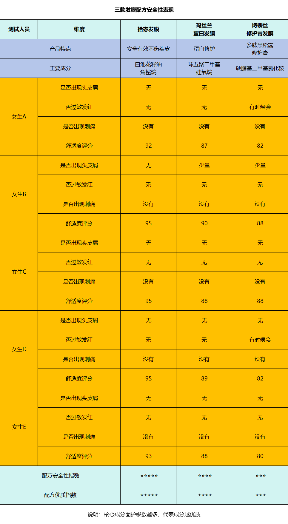 测评方法:连续使用这三款发膜两周,观察头皮是否会发生红肿、过敏等不适反应。特别注意是否出现头皮屑增多或掉发增加现象,并对每款发膜的安全性进行评分。