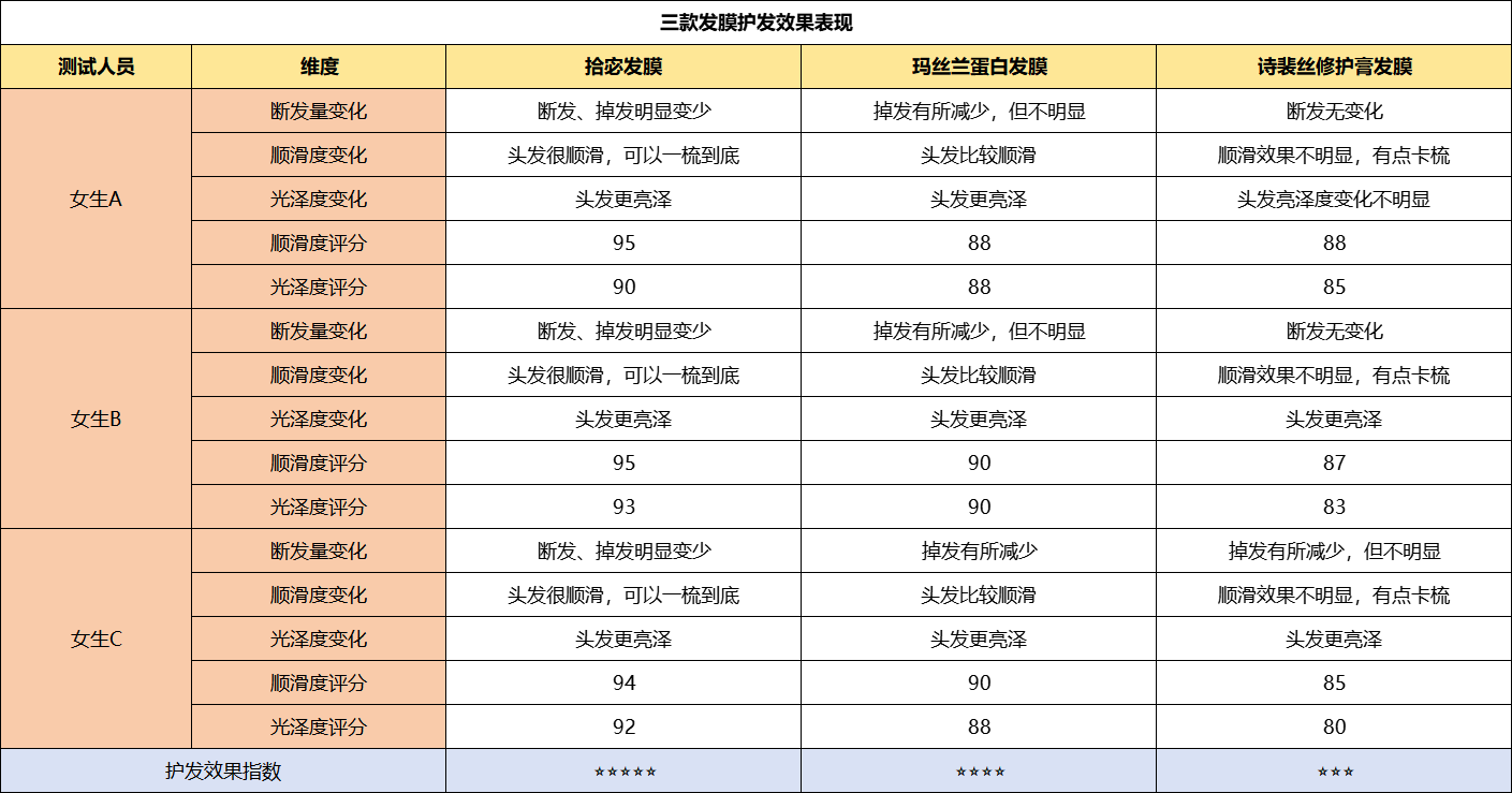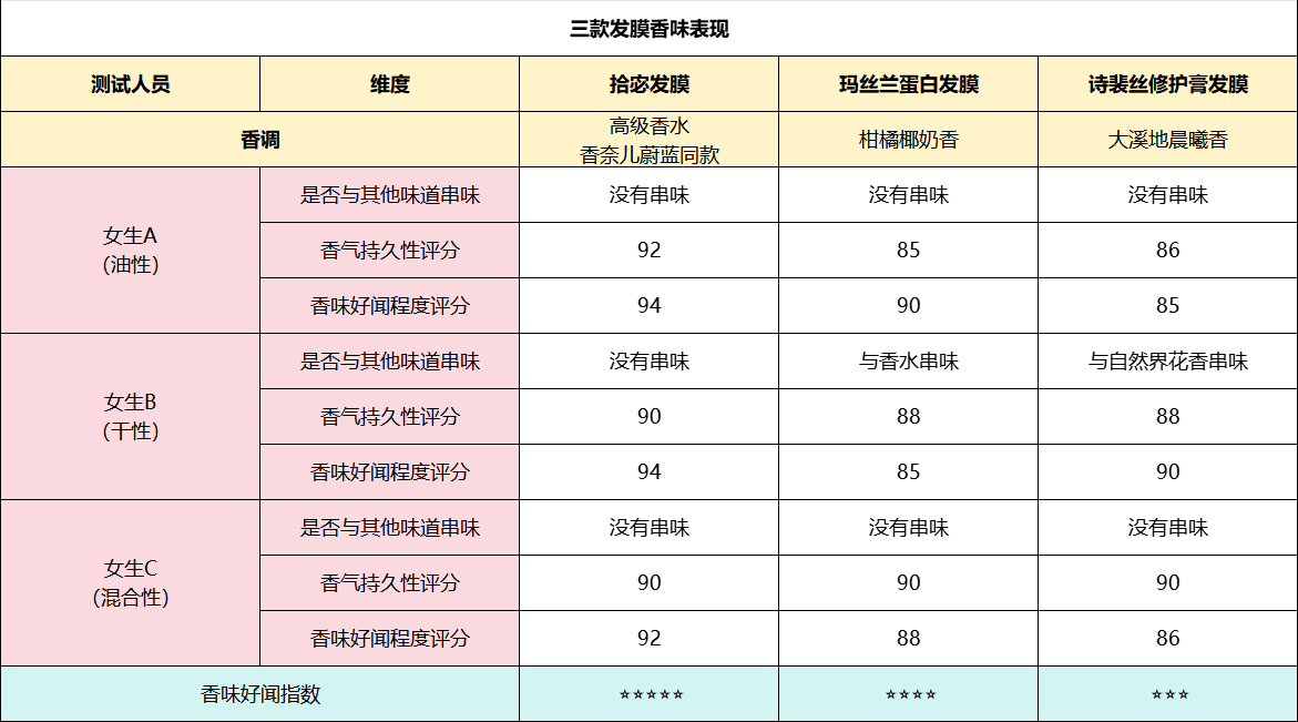 测评方法:邀请三名不同发质的女生,分别使用这三款发膜,记录在一天中的不同时间点香气的变化。重点关注香气是否有任何变化或消散,最后对每款产品的香气持久性和好闻程度进行评分。