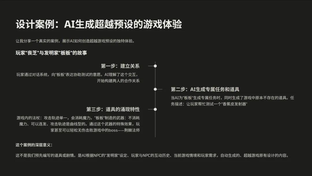 在前面的视频里我们提到过,在某次玩家测试中,有位玩家通过自己的描述生成了一个 AI 角色“发明家”。这个角色有非常鲜明的性格特征,而系统在后续任务中会依据这个角色设定,为玩家提供原本预设之外的强力道具。