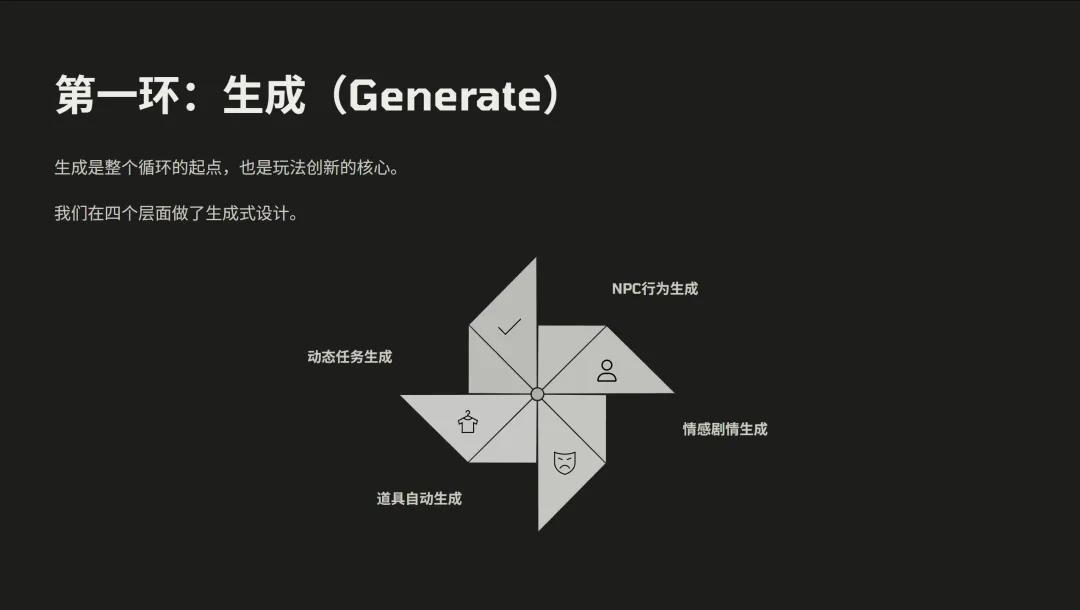 而生成式的玩法是有记忆的,是学习型的,每一次生成都会基于玩家的历史行为,系统会记住玩家的选择偏好,内容也会随着玩家交互去进化。玩家每一个选择,都会成为下一个阶段再生成的养料,从而形成一个自我强化的定向循环。