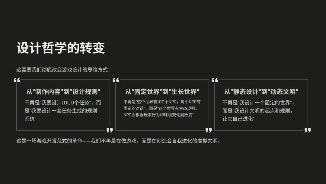 回到游戏设计的本质,我认为它从来不是内容的堆砌,而是规则的设计。围棋只有黑白落子,变化却无穷无尽;国际象棋只有几种棋子,却可以玩一辈子。我们的游戏也是如此:我们不需要预设每一个剧情,而是设计一套规则,让玩家、AI、世界在这套规则中彼此理解、反馈与进化,然后让无数独特的故事自然涌现。
