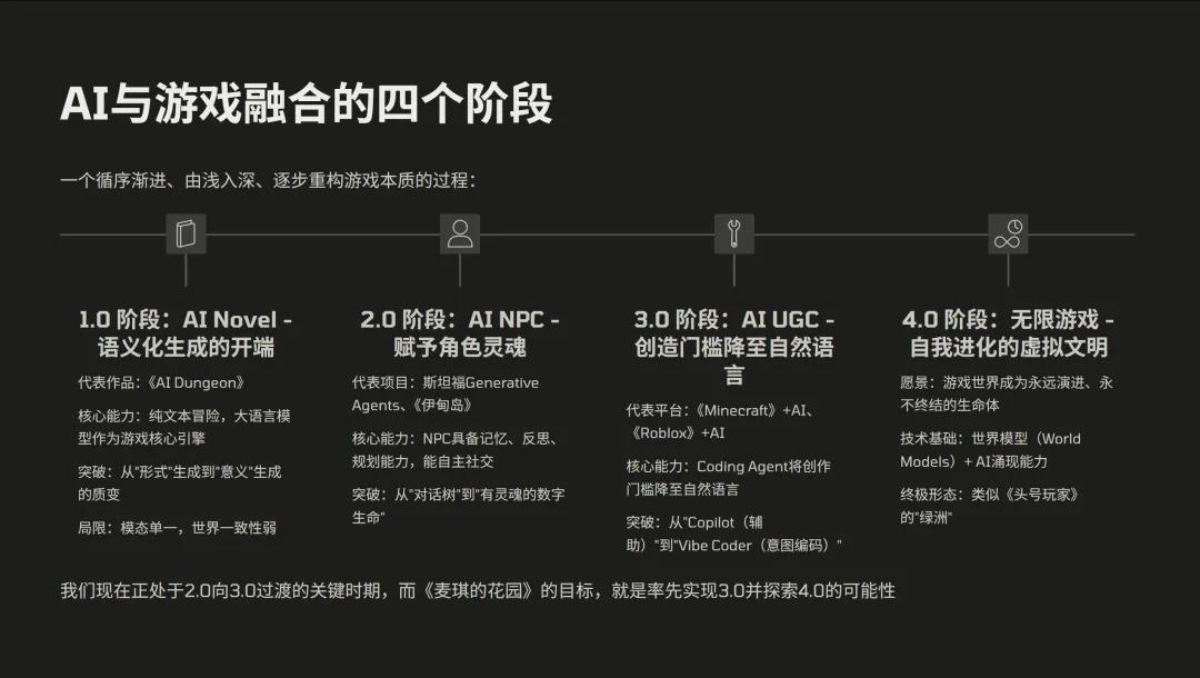 3.0阶段,我们认为是AI UGC 时代。在这个阶段当中,Coding Agent 将创作的门槛降低到自然语言,玩家直接能够进行游戏内容的创作。这极大地鼓励了玩家创作,并提升了内容质量,也缩短了制作游戏内容的周期。像《Minecraft》和《Roblox》这样的产品,其实在他们的游戏社区中已经有人率先尝试跟 AI 去结合。