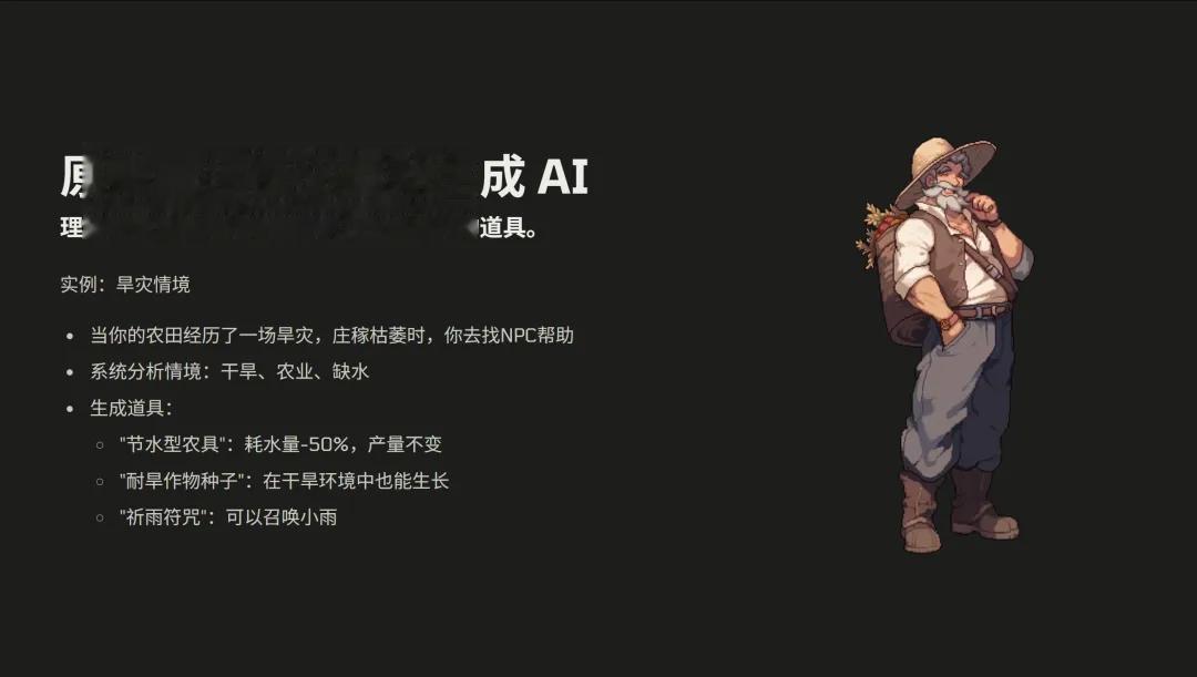举个例子,在游戏当中可能会出现一个旱灾的剧情。农田经历了一场旱灾,庄稼枯萎的时候,系统可以识别到你可能需要一些帮助。它也会识别到当前的情境是旱灾,农业缺水,生成的道具可能就会是节水型的道具,给你耗水量减 50%,但是你的产量不变。第二种就是耐旱的作物种子,比如说干旱的环境当中也能生长。第三种可能就像这种祈雨仪式的材料。