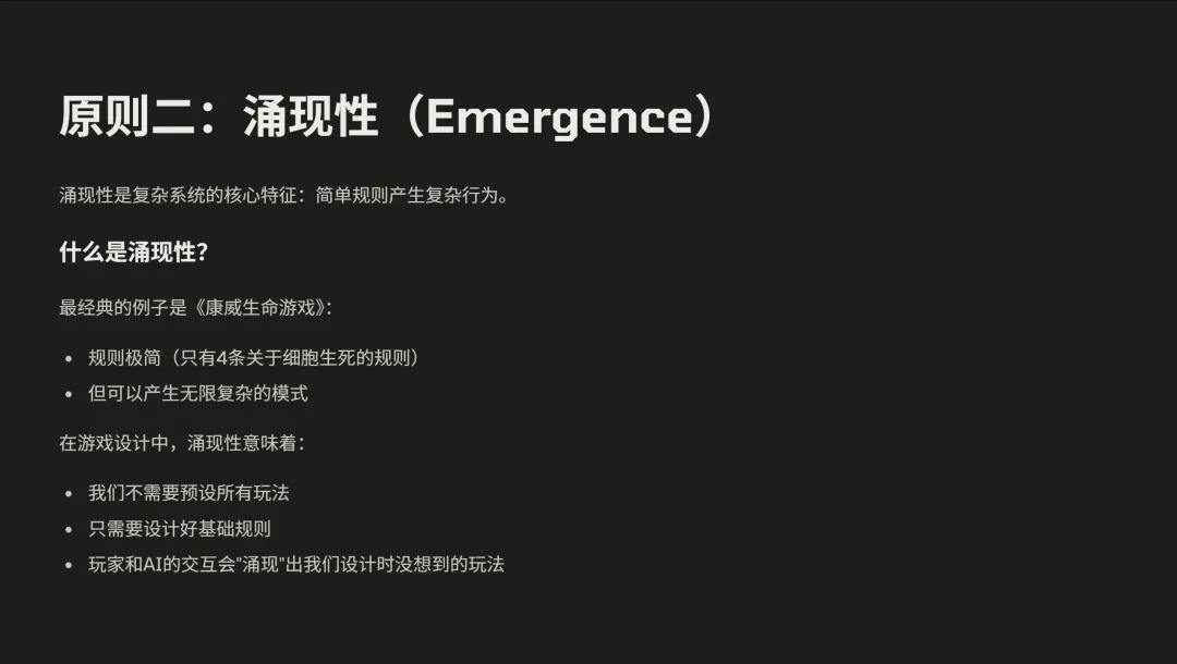 第二个原则是涌现性。听起来可能有点玄乎,但其实很好理解。它是复杂系统的核心特点——简单的规则可以产生复杂的行为。