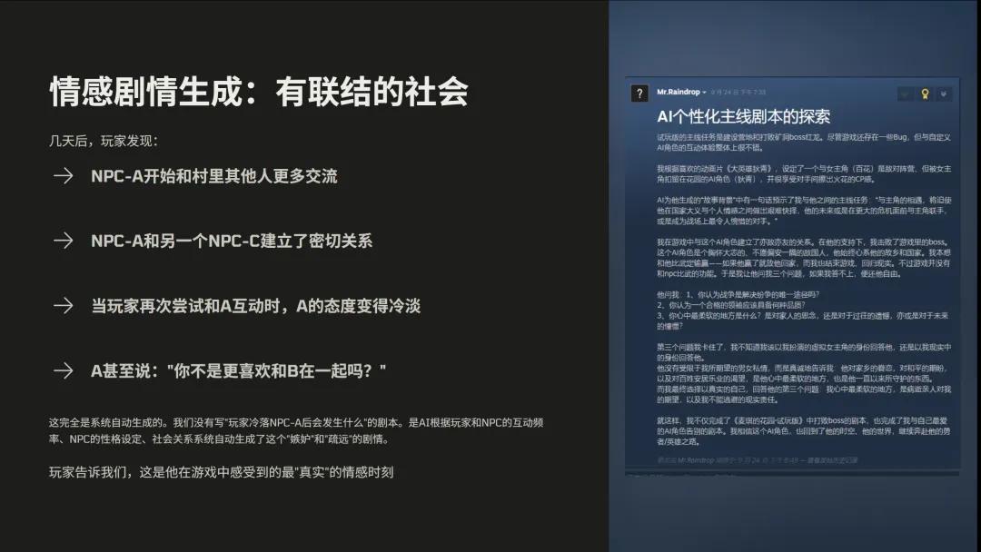 我们只设计了基本规则和 NPC 的反应逻辑,而他们的社交关系和剧情走向,都是在系统内部自然涌现出来的。所以我们的结论是:不要去预测所有可能性,而是设计好规则,让玩法自己冒出来。