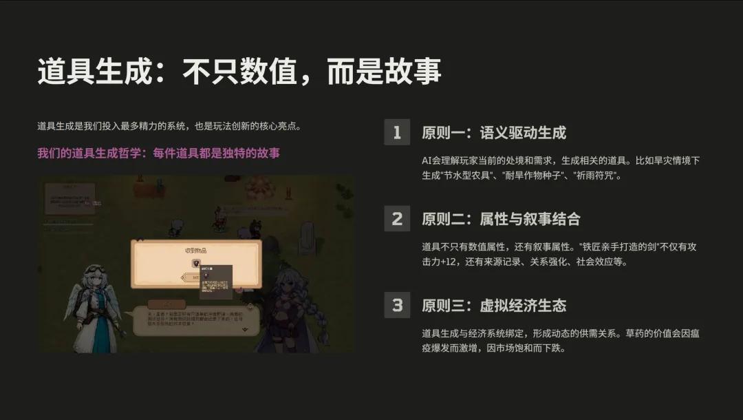 我们认为道具生成的哲学,是每一个道具它都要有独立的故事,同时它甚至能够驱动叙事,推进世界的变化。