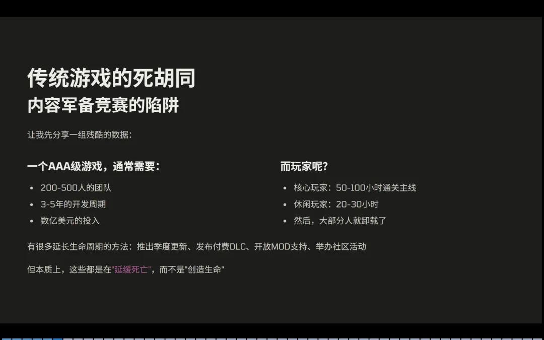 过去两年里, AI 爆发让我们看到另一种可能性,传统游戏逻辑是,开发者决定一切内容给玩家消费,随后这个内容就枯竭了,游戏从而走向死亡。
