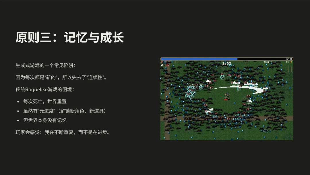 接下来的原则是“记忆和成长”。肉鸽游戏的一个常见陷阱在于:每次重开都是新局,缺乏延续性。很多游戏中,玩家死亡后世界归零,虽然每次可能都有进步,但世界本身是静止的。久而久之,玩家会感觉自己只是在不断重复,而不是在真正成长,最终会觉得无聊。