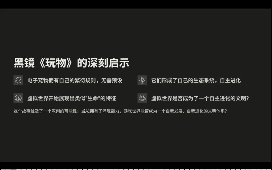 这就像是一场永无止境的军备竞赛。我们不停地做加法,但从未问过一个根本问题:能不能让游戏成为一个自我生长的生命体?能不能通过 AI 涌现,让游戏世界自己进化成一个文明?