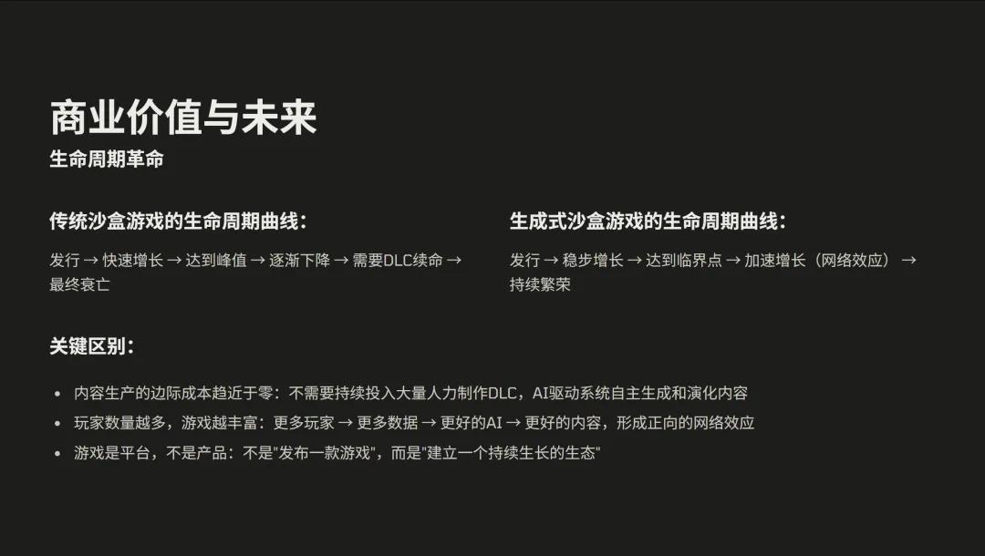 从商业价值来看,我们认为这代表的是一种全新的生命周期模式。传统游戏的生命周期是:发行→快速增长→达到峰值→逐渐下滑→进入衰退。而生成式沙盒游戏在发行和增长之后,会在达到临界点时形成一个自我演化的生态,进而形成持续繁荣的能力。