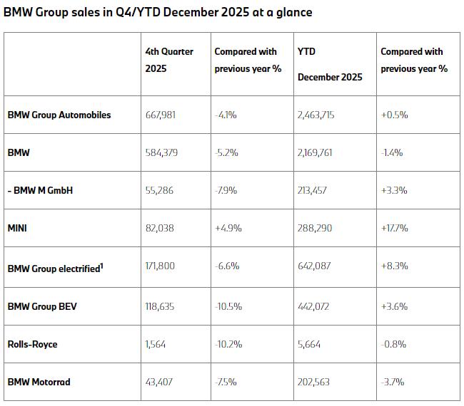 2025年第四季度,宝马集团遭遇年底“翘尾”失灵,单季度总销量同比下降了4.1%;BMW品牌同比下降5.2%,MINI品牌同比增长4.9%,劳斯莱斯品牌同比下降10.2%。