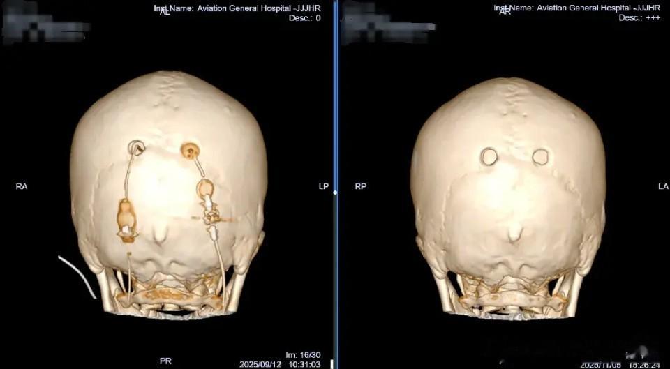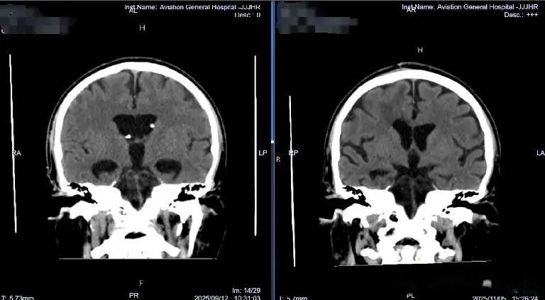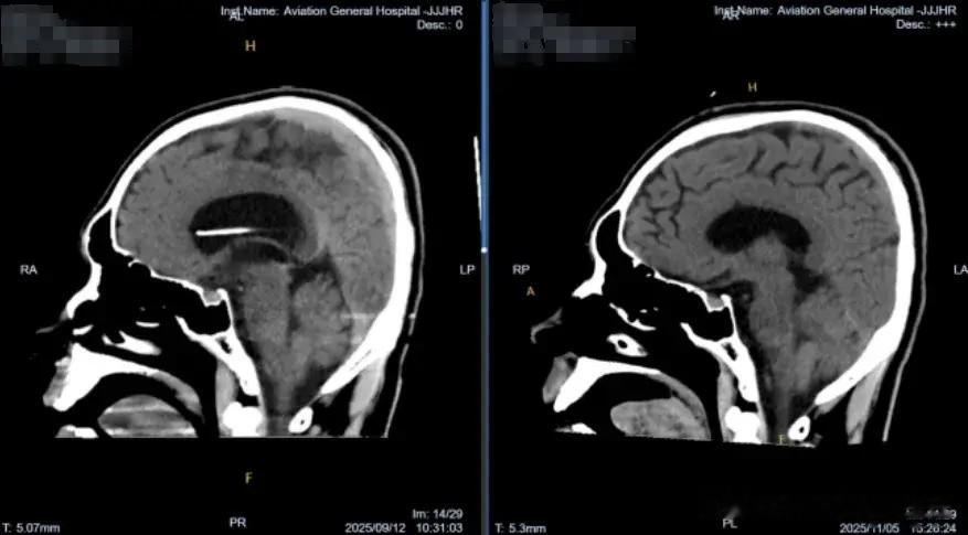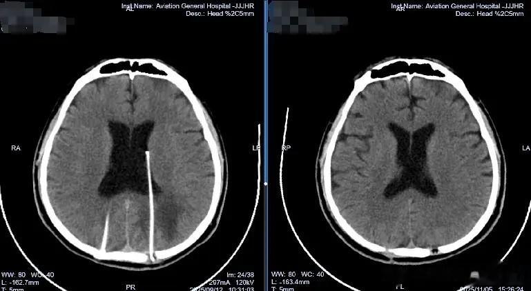 更令人欣喜的是,小郭的意识状态逐渐恢复,从昏迷转为清醒,认知功能明显改善。2025年10月30日,小郭成功接受了脑室分流管去除术,复查头颅CT显示脑室系统稳定,未出现异常扩张。出院时,小郭一般情况良好,未诉明显头痛、头晕,无恶心呕吐,无发热,虽然言语表达和思维反应仍稍迟钝,但已能正常进食进水,四肢可自主活动。