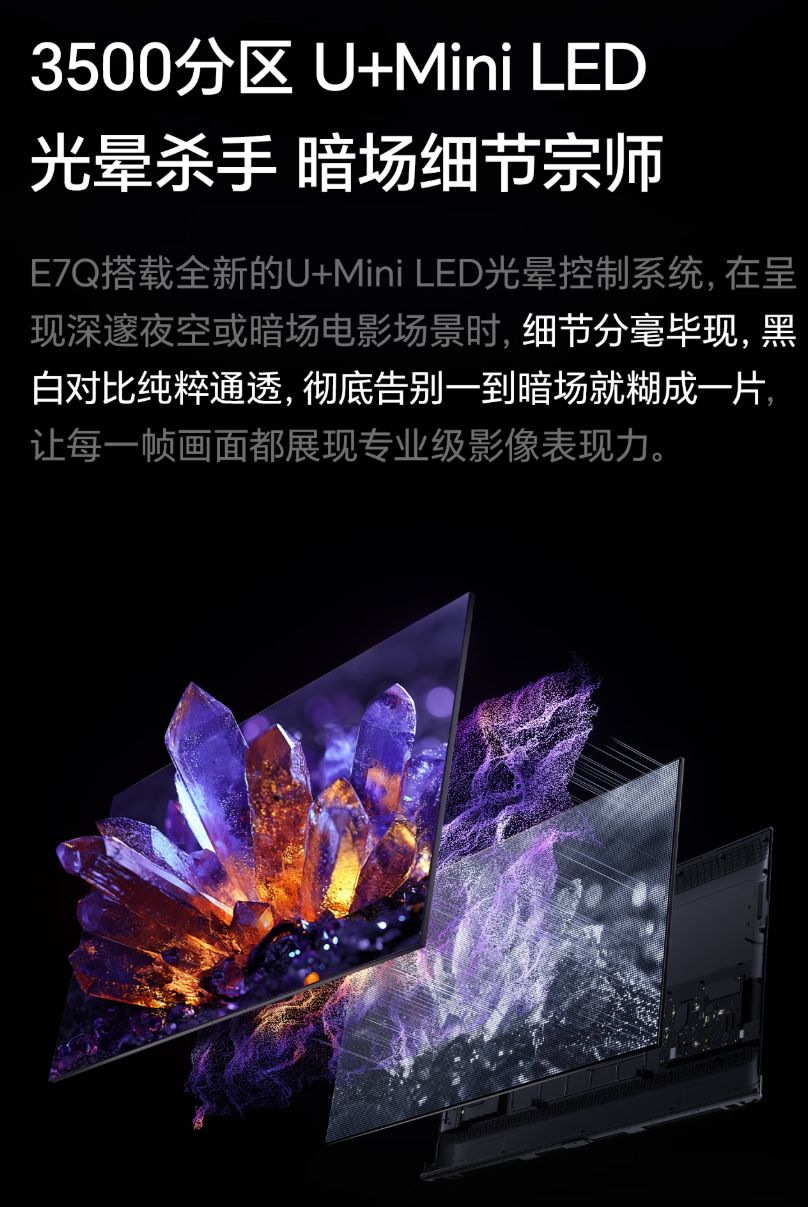 海信E7Q拥有的3500U+mini LED光晕控制系统,能分区实现像素级控光,分区密度是某品牌 Q9M(2000分区)的2.1倍。播放《星球大战》光剑对决时,E7Q的光剑轨迹无光晕,竞品则出现明显拖影;暗场亮度均匀性达92%(竞品仅78%)。
