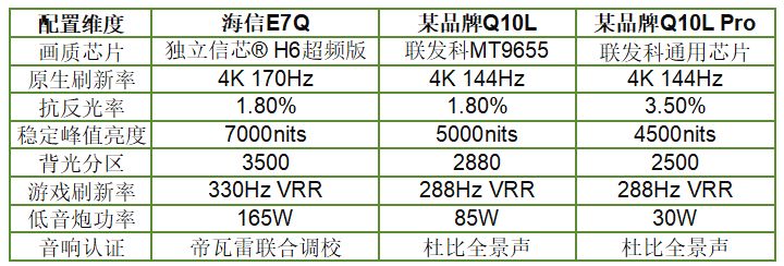 每款硬件搭载的芯片还是很重要的,就如同电脑独立显卡与集成显卡的区别,海信E7Q搭载了国产唯一自研真独立画质芯片信芯® H6超频版,实现从芯片解码到屏幕显示的全程自主优化。而某品牌的Q10/Q10L Pro依赖联发科通用芯片,缺乏针对性画质调校,类似“公版方案”,第三方测试数据显示其色彩还原偏差率高达15%。