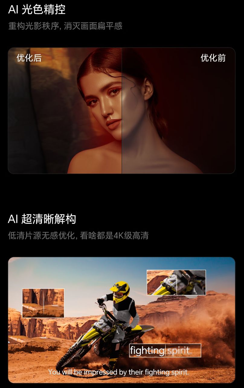 加AI内容自适应,独显芯片可自动识别电影、游戏、体育等场景,动态调整对比度/色彩/锐度。播放老旧DVD时,E7Q通过SR超分技术将分辨率提升至接近4K,而某品牌 Q10仅能做到标清优化。