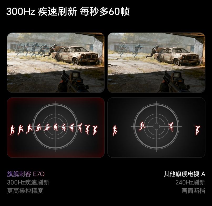 作为一款电视,对于游戏玩家来说,还是一个更大尺寸的显示器。海信E7Q拥有330Hz高刷新率,堪称是游戏物理外挂,比某品牌 Q10L Pro的288Hz每秒多刷新42帧,实测《赛博朋克2077》快速甩枪时,E7Q的残影长度比竞品短35%,操作响应速度提升22ms。