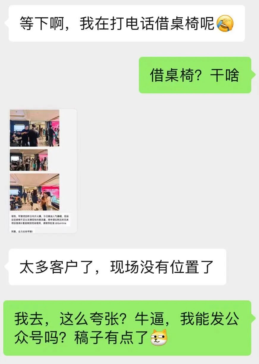 据爆料,今天众多客户赶在涨价前过来选购,案场人气火爆,甚至洽谈桌不够用!紧急借调了兄弟项目的桌椅来使用,这泼天的客流量,有多久没在案场看到了?