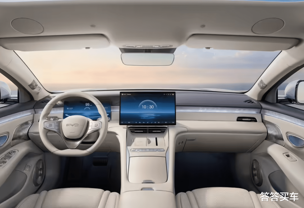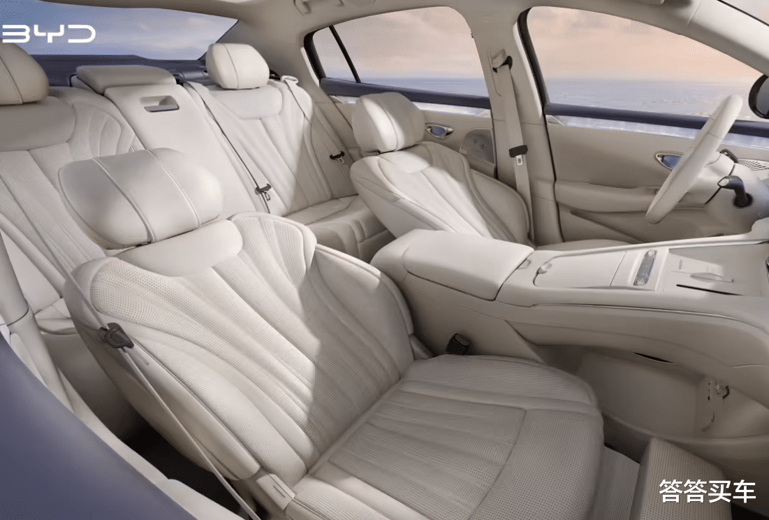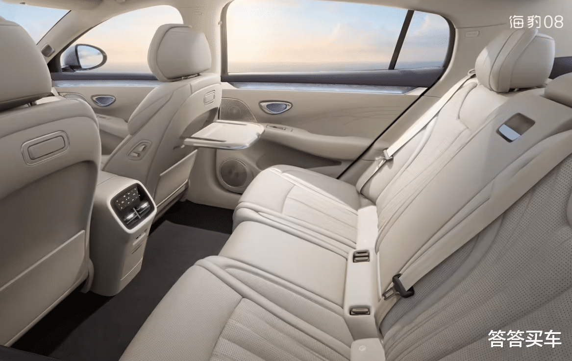 内饰方面,比亚迪海豹08采用海洋美学2.0全新旗舰座舱,车内应用大量的皮质包裹,在方向盘、空调出风口、按键、扬声器等处加入了镀铬装饰,继续采用怀挡设计,保留了部分物理按键。新车在扶手箱后方设置了空调控制屏,为二排乘客提供宽大的中央扶手以及小桌板,后排座椅拥有大角度靠背调节,大面积的天窗使视觉更通透。