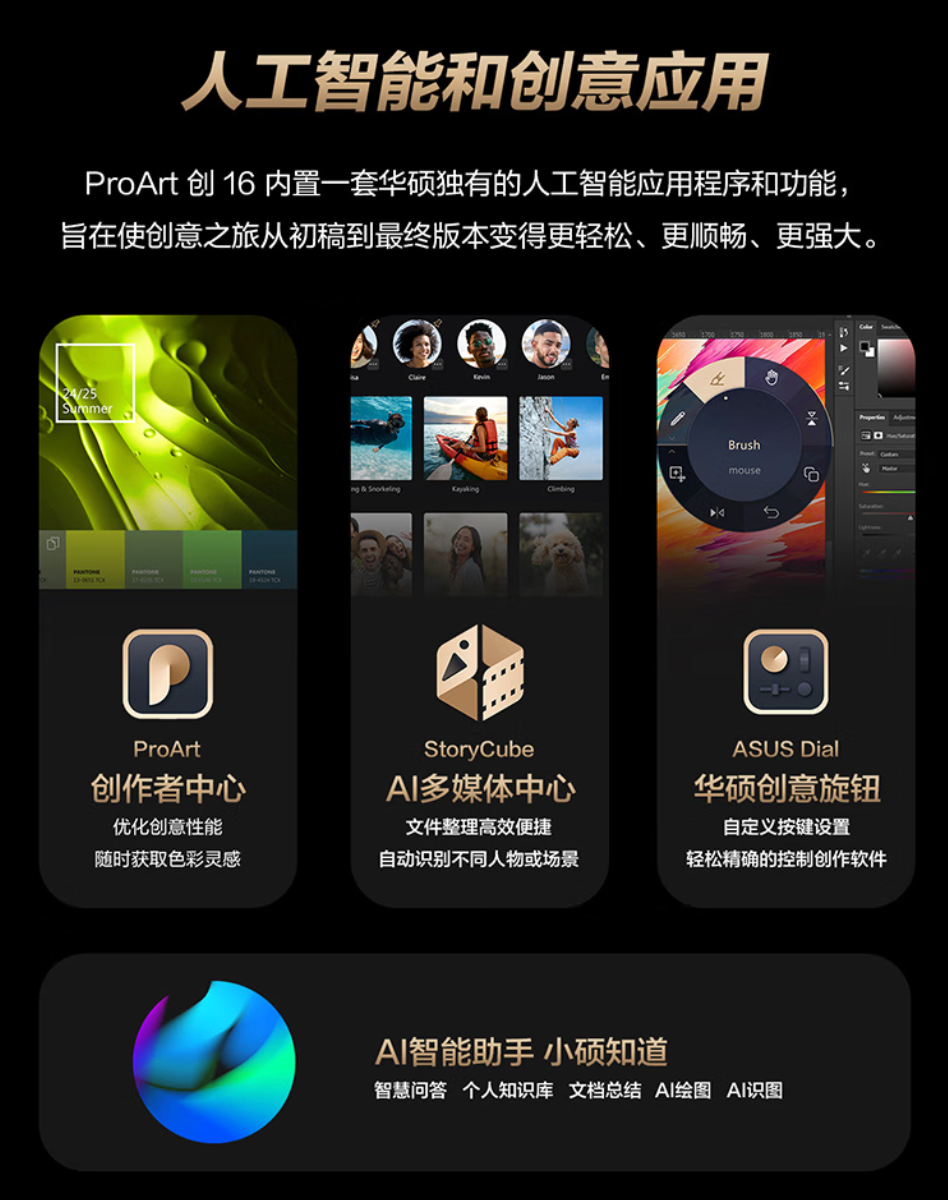 AIGC时代,工具决定效率,效率成就作品。华硕ProArt 创16拥有一套华硕独有的人工智能应用程序和功能,让效率实现质变。其中,ProArt创作者中心可监控设备状态、自定义设置和增强工作流程,充分激发创作想象;StoryCube AI多媒体中心能自动识别不同人物、场景,快速整理分类照片、视频素材,助力高效管理素材;“小硕知道”AI智能助手,依托端云一体大模型在无网络环境下也能保持高效创作,并带来智慧问答、文档总结、个人知识库、AI绘图、AI识图等功能,成为随身的创作助手;华硕创意旋钮,深度适配Adobe、剪映等创作软件,指尖旋转即可实现超70个快捷功能,助力精准调整创意设计软件中的各项参数。