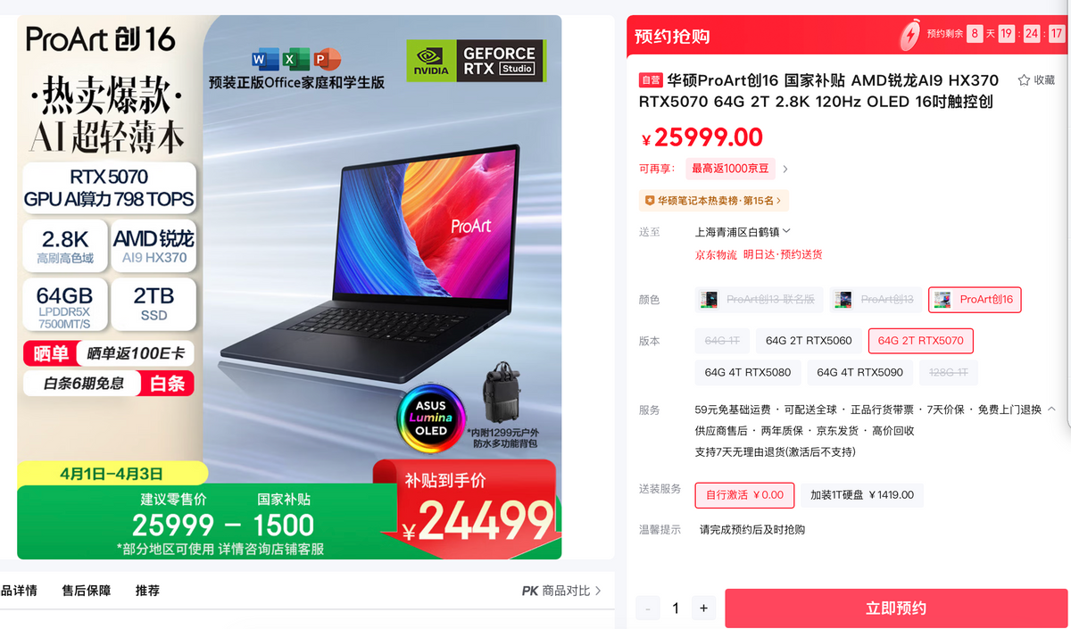 在AIGC渗透设计、影视、创意制作的今天,一台专业创作本不仅要性能强悍、色彩精准,更要具备强大的AI算力,以全能适配当下的创作节奏与专业需求。专为创作者而生,华硕ProArt 创16配备AMD锐龙AI 9 HX 370移动处理器、RTX 5070独显、2.8K 120Hz OLED华硕好屏等硬件,以专业级定位、高效创作体验和AI全场景赋能,成为设计师、剪辑师等内容创作人群的理想伙伴。