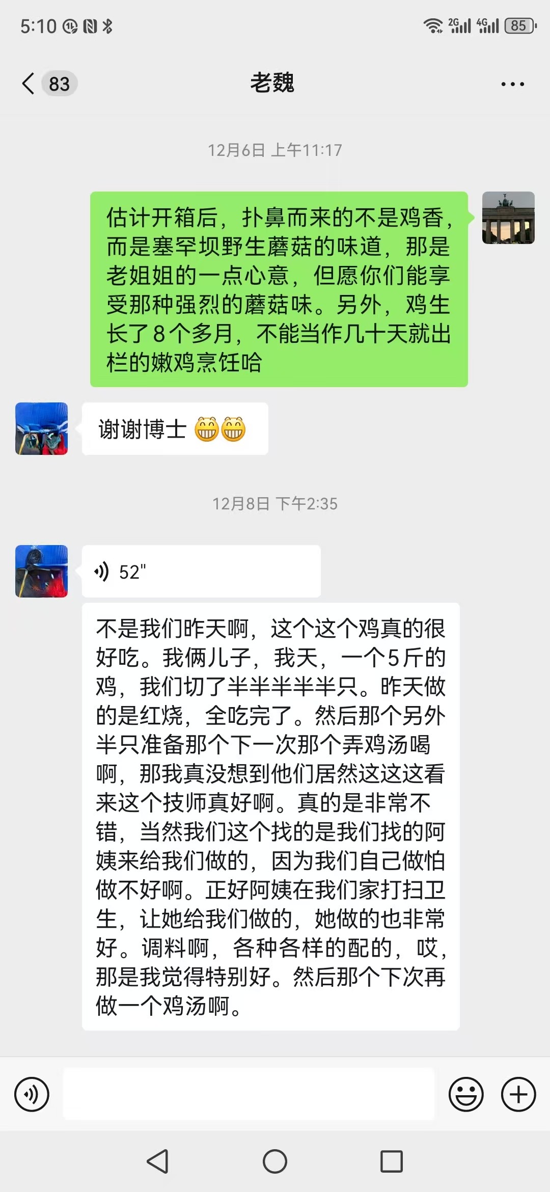 老魏是塞罕坝出产博士的朋友,他说:怕自己做不好,就让来家打扫卫生的阿姨做,她把5斤多重的鸡切了一半做红烧,这个鸡真的很好吃,俩儿子(刚上小学)全吃完了,真没想到他们居然这么爱吃,看来这个鸡是真好啊!真的是非常不错!特别好!下次再做一个鸡汤啊。