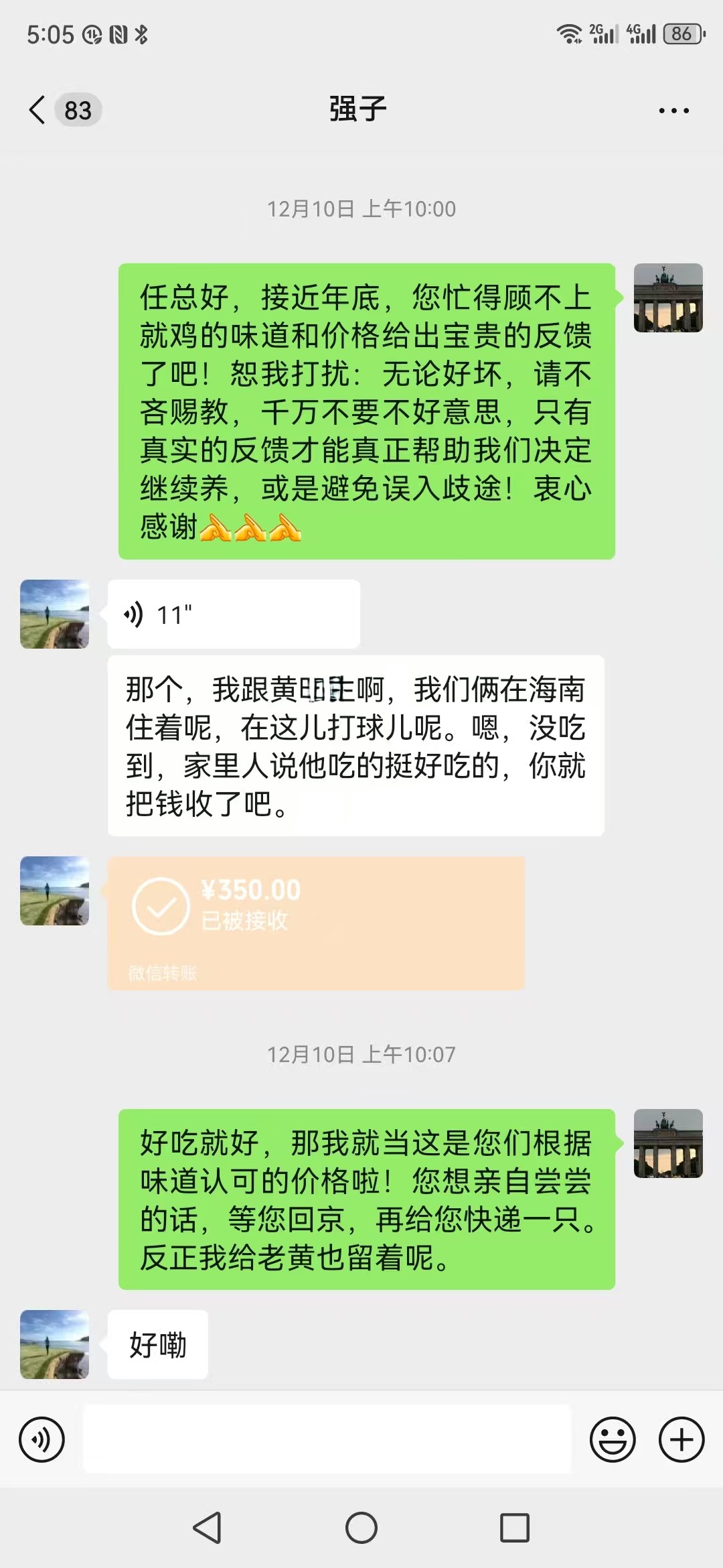 任总在海南打球,没吃到,但家里人说挺好吃的,根据味道支付自己认可的鸡价为 350元,相当于每斤约 60元。