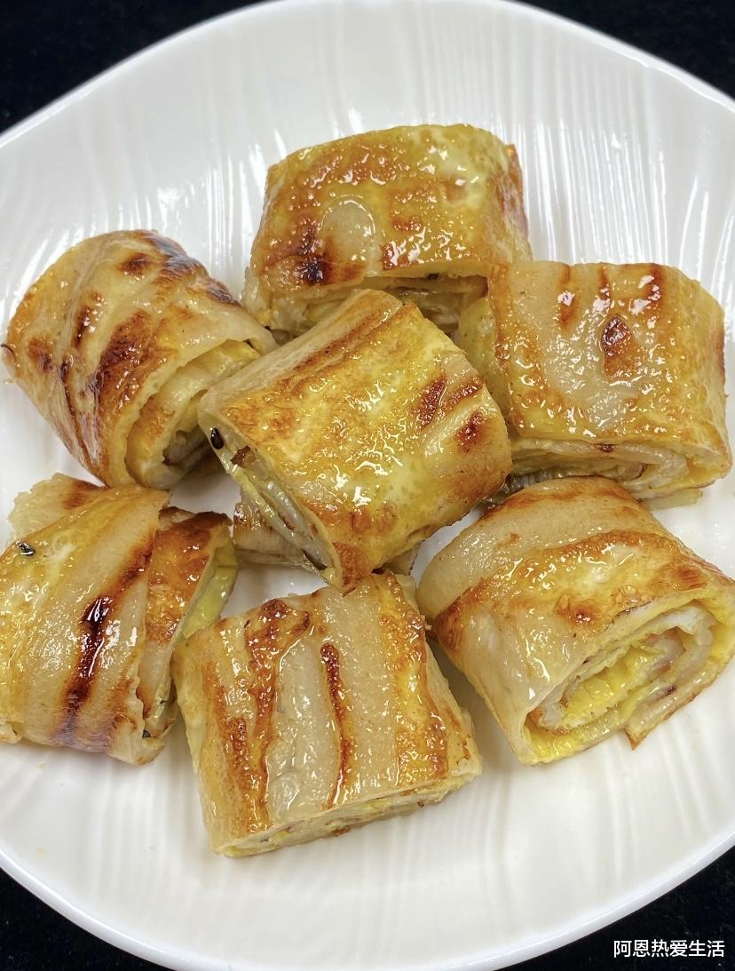 第七步:卷切开吃,翻面后再煎30秒,让另一面也煎至金黄,然后用铲子从一端慢慢卷起来,卷成紧实的蛋卷状,关火后静置1分钟,再切成小段,就能直接开吃啦,嘎嘎香!