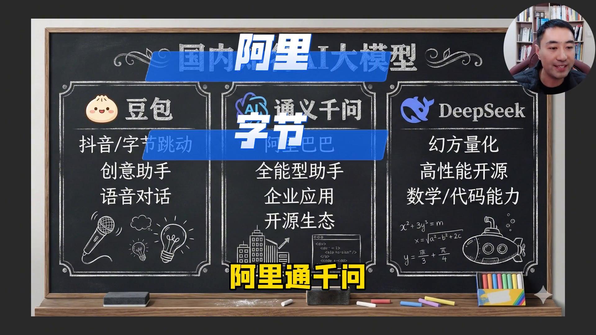 ·首先出场的是国内最知名的三大模型:字节的豆包、阿里的统一千万,还有深度求索的deep sink。这三个模型它们之间的区别其实相对来说比较小,只不过现在千问有了可以帮你自动点餐的功能了。比如想要去订奶茶或者是想要去订饭,只需要告诉千问,千问会去调用你的某宝,然后帮你自动的支付和下单来帮你去订餐,这是它的区别。