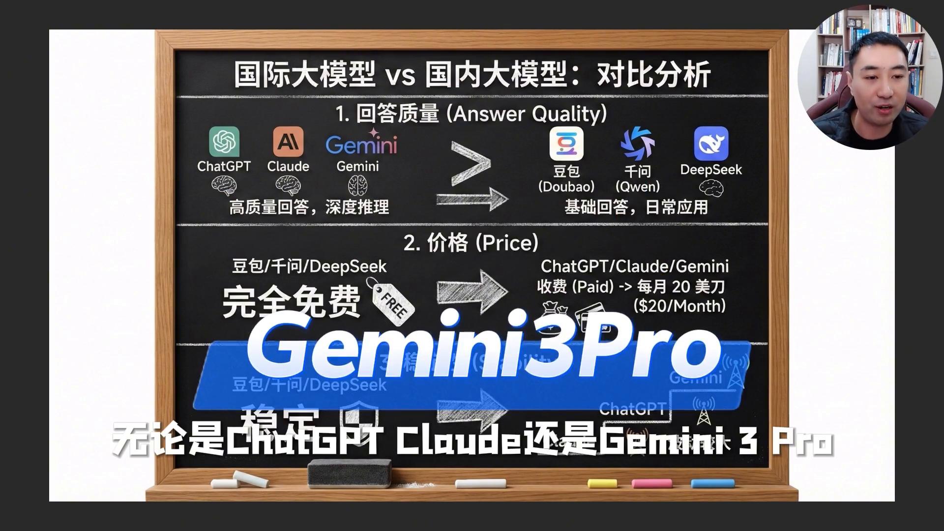 ·首先是回答质量,这时候不用说了,国际的这些大模型无论是GPT Claude还是Gemini3Prg,它们的回答问题的质量是大于豆包、大于腔吻、大于DeepSeek的,这个不用说了。在基础问答日常应用的时候使用国内的大模型就行了,但是高质量的回答、深度推理、深度分析还是推荐大家使用国际的大模型的。