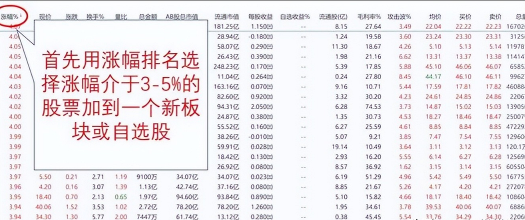 优选涨幅在3%-5%之间的个股。为什么不是涨6%、7%的?因为这种往往多方已经“用力过猛”,第二天高开低走的概率大;而涨幅不足3%的,说明多头力量偏弱,可能只是打个酱油。