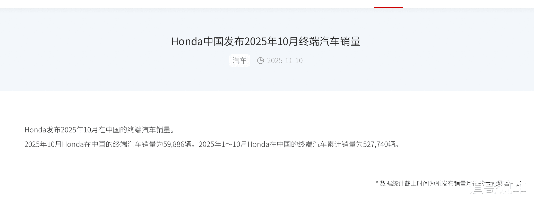 值得关注的是,飞度的惨状一定程度上也是本田在华市场表现的写照。本田发布的2025年10月在中国市场的终端汽车销量数据显示,其终端汽车销量为59,886辆,同比下滑20.6%,而这已经是本田今年连续第10个月销量同比下滑。