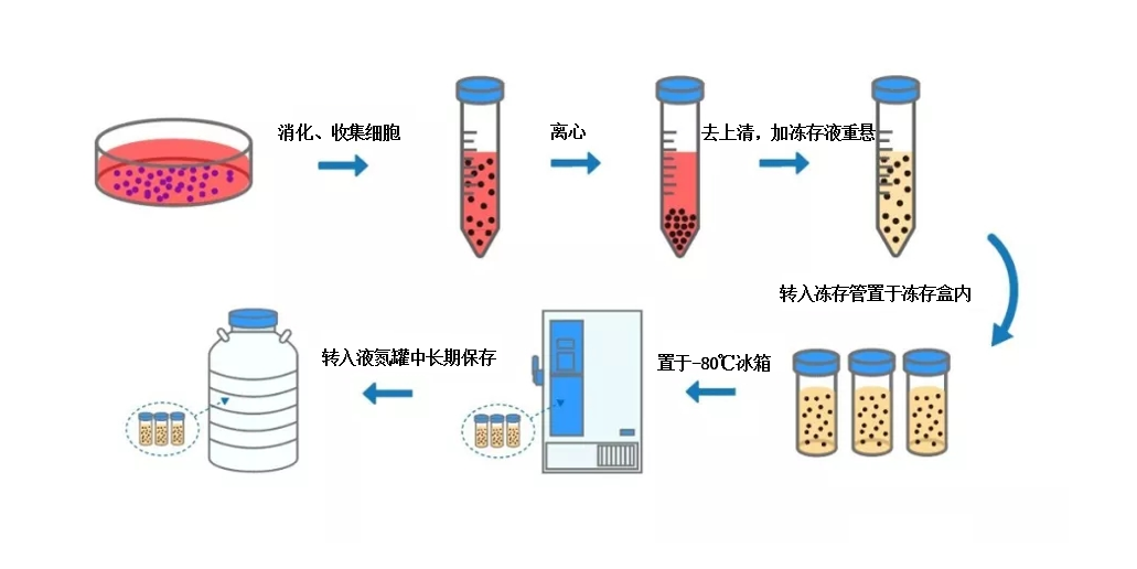 利用冻存技术将细胞置于-196℃液氮中低温保存,可以使细胞暂时脱离生长状态而将其细胞特性保存起来,这样在需要的时候再复苏细胞用于实验。