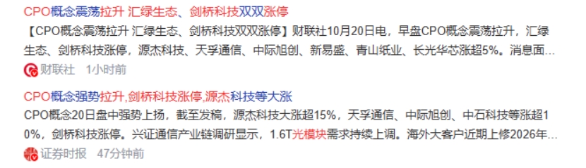 早盘光模块CPO板块直线拉升,汇绿生态、剑桥科技景旺电子涨停,源杰科技、天孚通信、中际旭创、新易盛、青山纸业、长光华芯涨超5%。