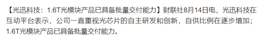 1.6T光模块:公司在8月底表示,预计未来两个季度1.6T将持续量产和规模出货。
