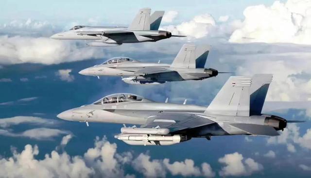 美军航母上的F-18“三兄弟”,远处是单座型的F-18E,用于制空、中间的是F-18F多用途型,主要用于反舰/反舰、近处的是EF-18“咆哮者”电子战攻击机。