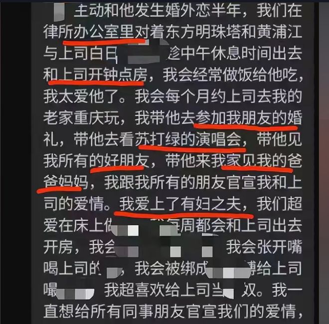 女律师在描述中直接到位,用语粗俗,如“在办公室里忘情的做着不可描述的事,也经常出去看钟点房,我们像夫妻一样我给他做饭,他陪我去老家重庆,见家长、看演唱会、出席朋友婚礼”,这些细节让人震惊不已。