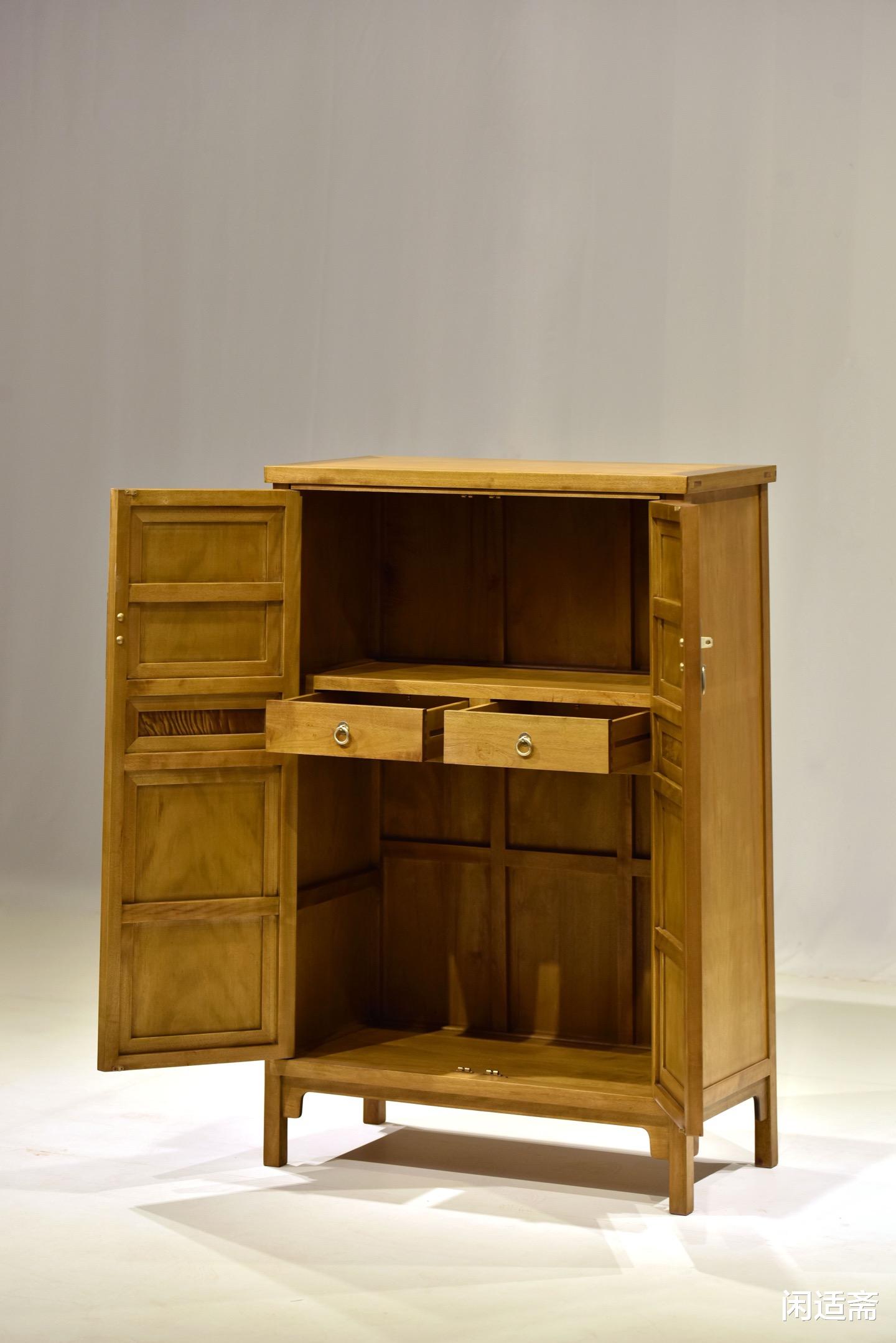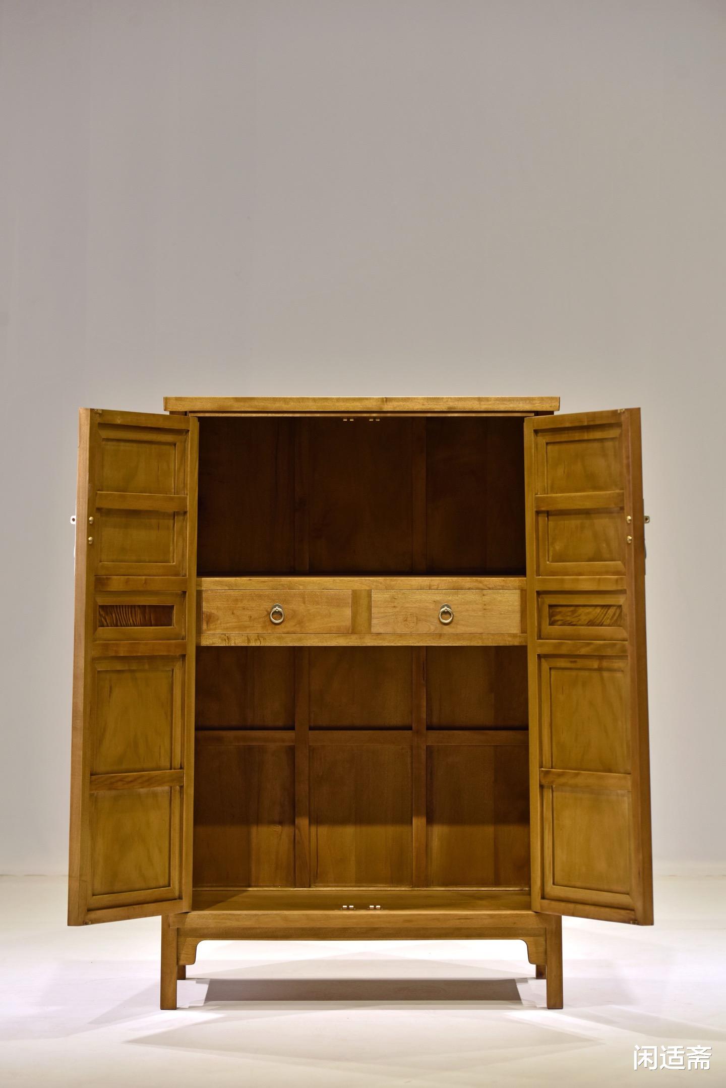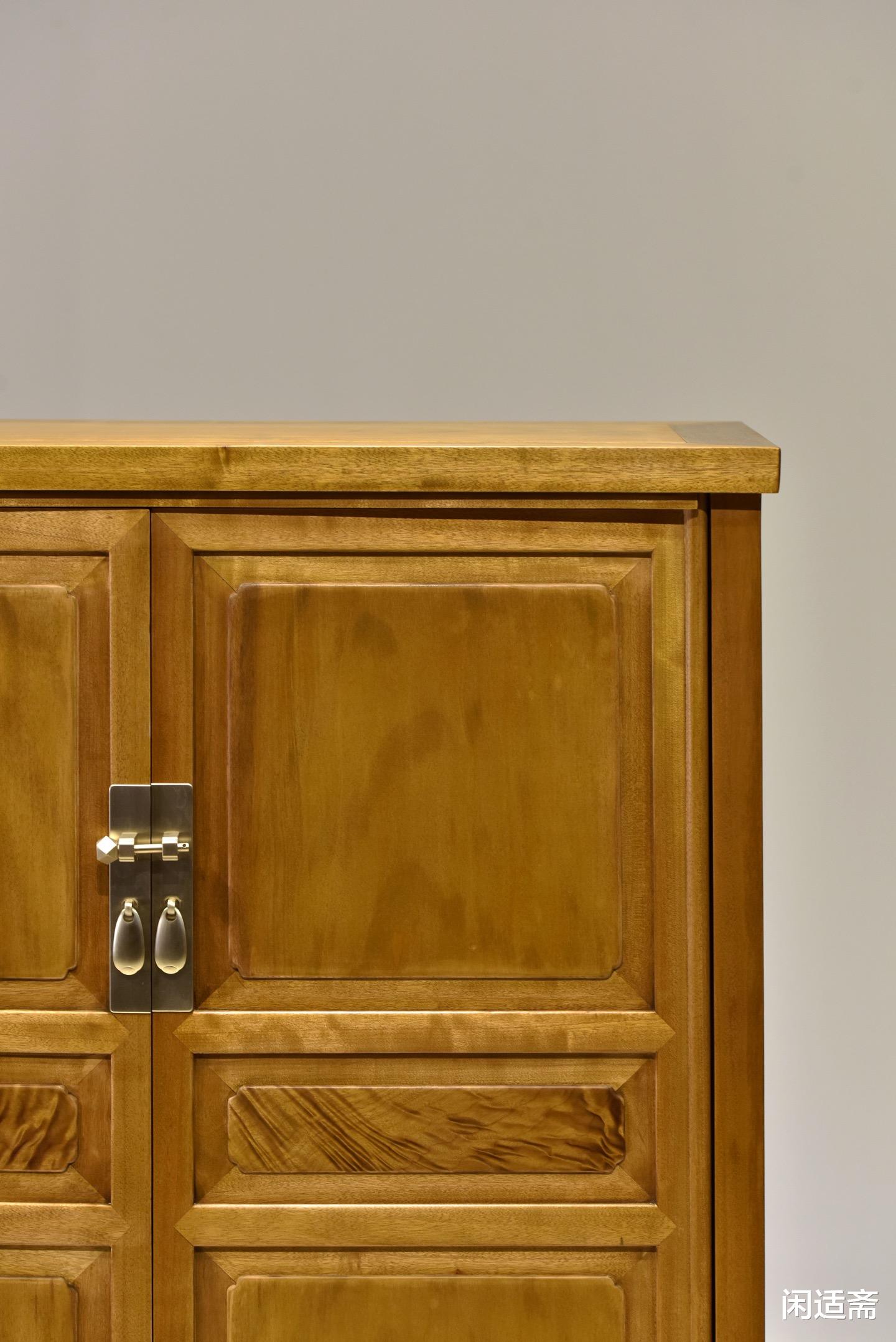 三抹门设计是此柜的点睛之笔,将实用收纳与装饰美学巧妙融合,尽显匠人造物巧思。三抹门即柜门由上、中、下三段组合而成,分段设计既增强了柜门结构强度,又丰富了视觉层次,避免整体造型单调。