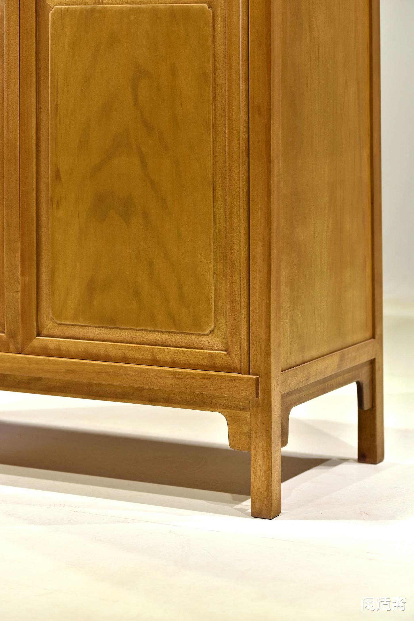框架采用全传统榫卯结构攒接,柜帽与腿足、柜门与柜体的衔接严丝合缝,无一枚铁钉,既保证了结构稳固耐用,又让整体造型浑然一体。方材腿足线条挺拔,转角处经精细打磨,方中见圆,既保留了方材的沉稳,又兼具圆角的温润,与柜帽圆角过渡呼应,诠释“圆融和谐”的中式处世哲学。
