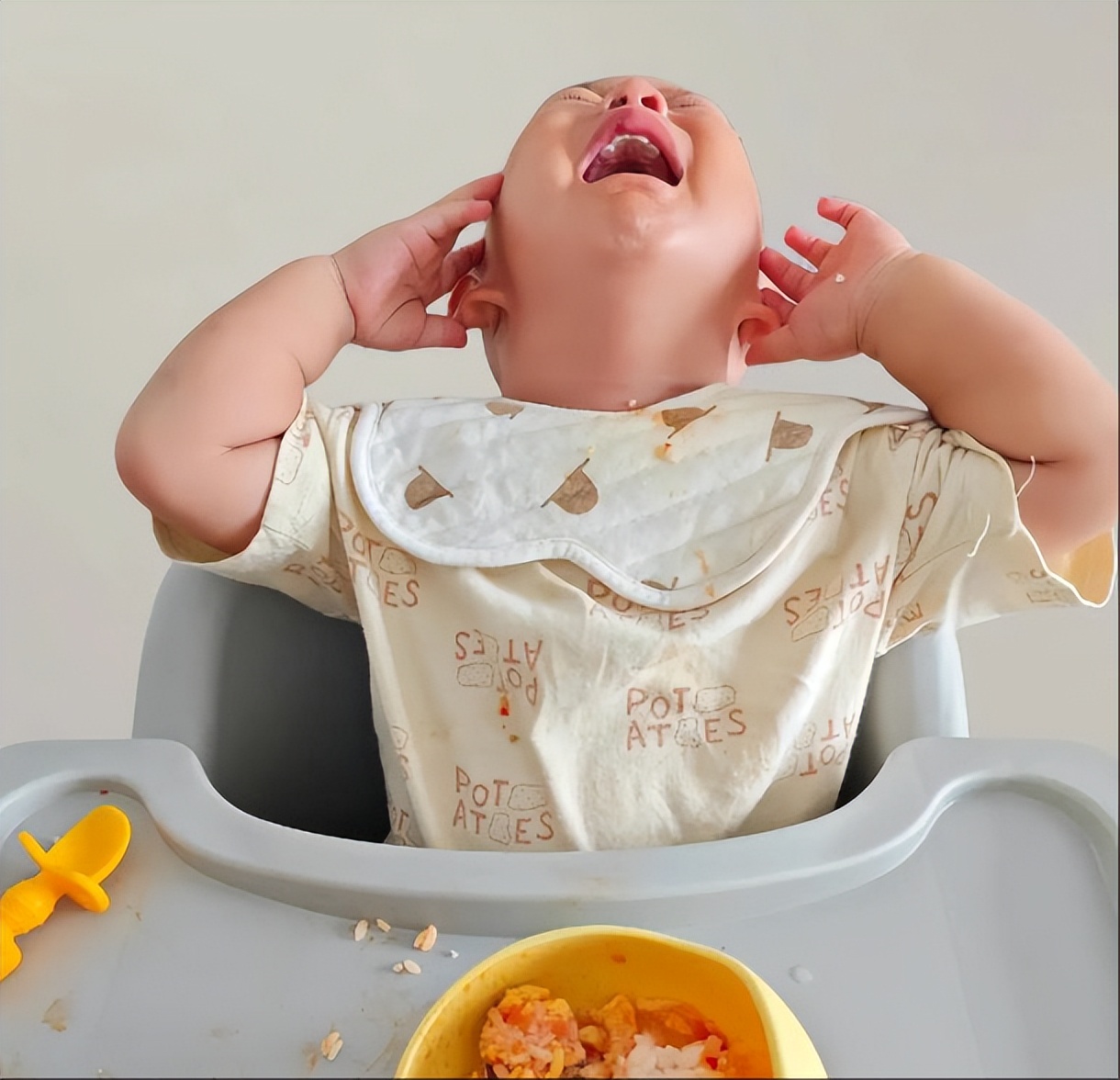 婴幼儿口腔触觉非常敏感。任何纤维感强烈、粘附感强的食物都可能被宝宝解读为陌生、不舒服甚至“危险” 的信号,触发本能的排斥反应(比如刺激引起呕吐反射而出现的干呕)。没有经过正确辅食从细到粗过渡的宝宝,特别是长期吃用辅食机搅打的细腻混合糊状辅食的宝宝,口腔敏感性更高。
