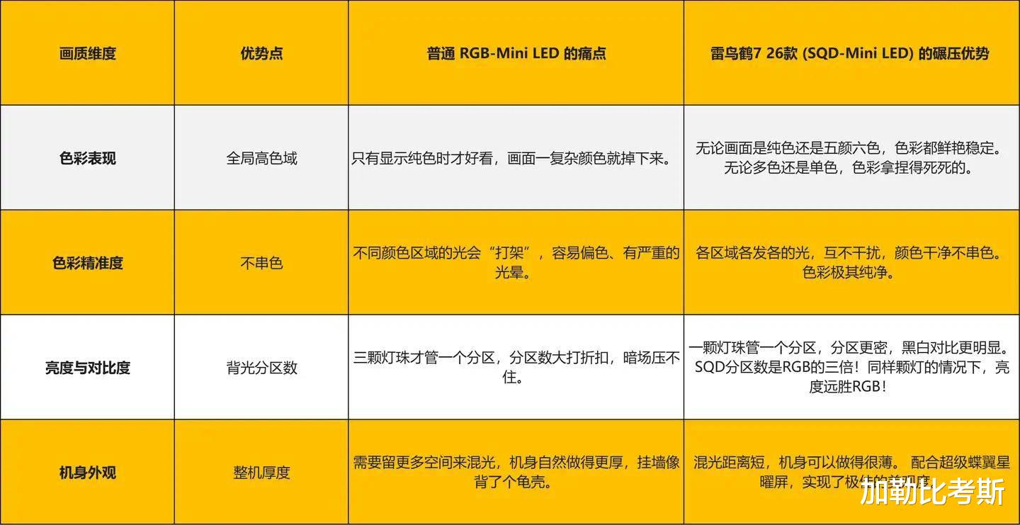 最后再来说说,其实关于Mini LED技术的讨论中,SQD-Mini LED 与 RGB-Mini LED 之争一直是行业焦点。两者虽然都隶属于Mini LED阵营,但在实现画质三要素的方式上,存在着本质的差异。