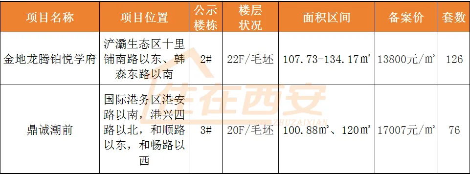 3月3-4日,西安2盘两百余套房源公示一房一价。含浐灞国际港浐灞片区的金地龙腾铂悦学府,以及港务片区的鼎诚潮前。