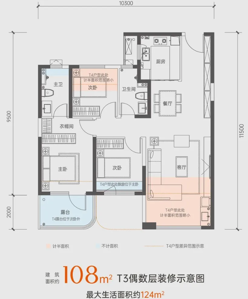 其中约108㎡户型,三室两厅两卫的设计。整体来看,该户型布局方正,全明设计,动静分离明确。采光方面,三面朝南,采光佳;其中含南向阔景阳台,阳光私密主卧套,南向次卧。另外户型还设有独立入户玄关,LDKG一体化。奇偶层不同,露台位置不同,不过作为四代住宅,得房率较高,生活面积大。