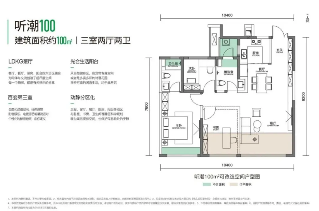 从户型面积来看,项目起步面积较小,其中约100㎡户型,三室两厅两卫的设计。