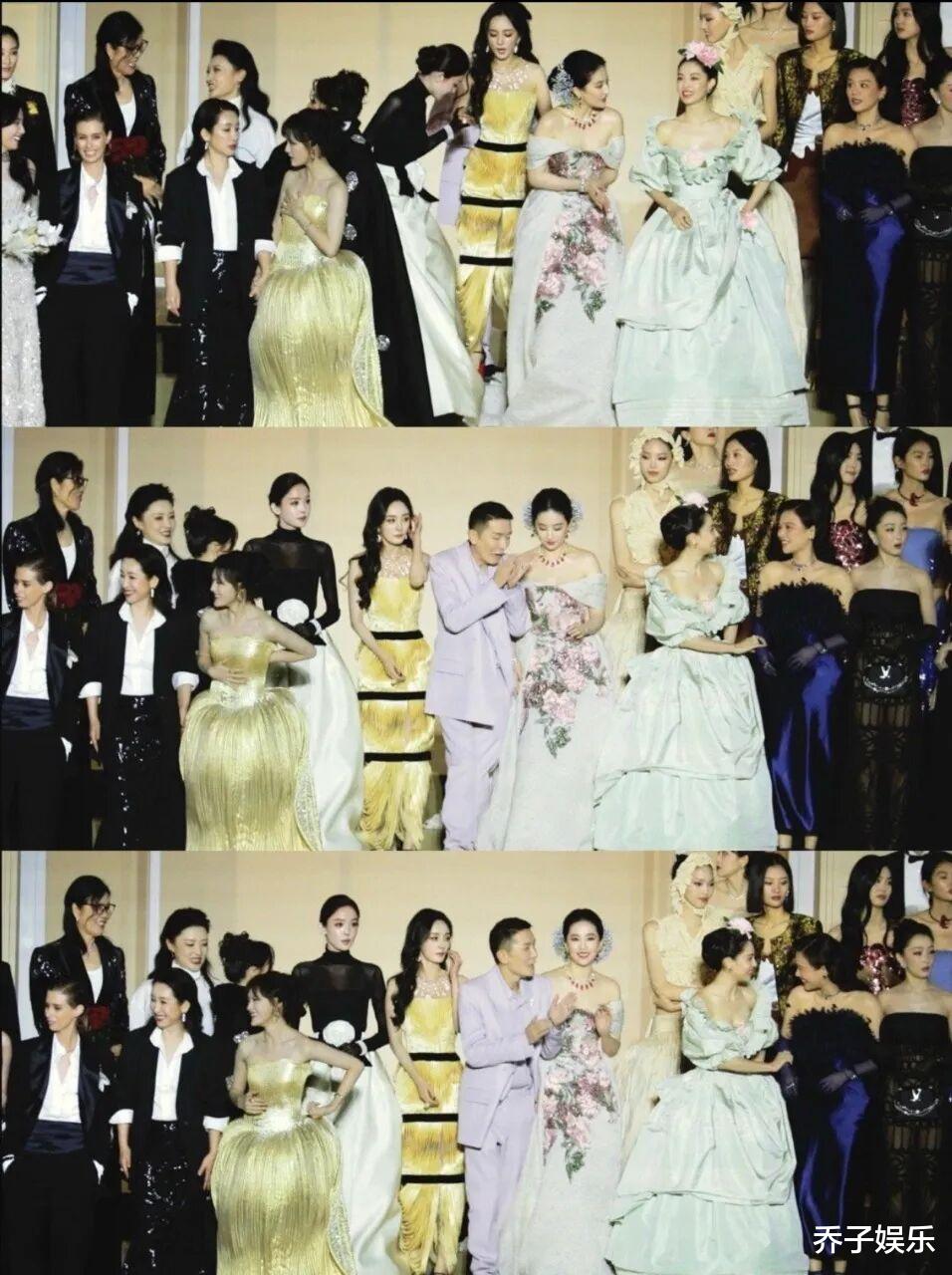 刘亦菲,杨幂,娜扎和刘冲中间挤的要命,杨幂娜扎肩膀都没伸展开,刘冲还被挤得踩了天仙的裙子,一边挤的要死就她独美,网友能不生气嘛?