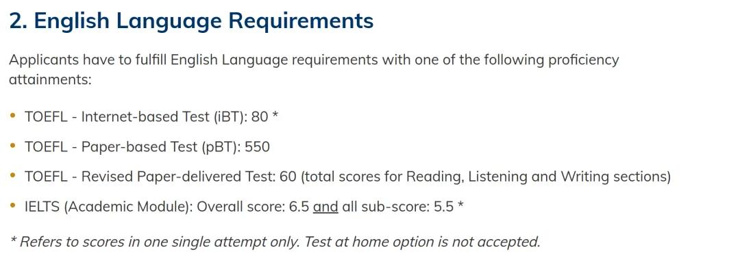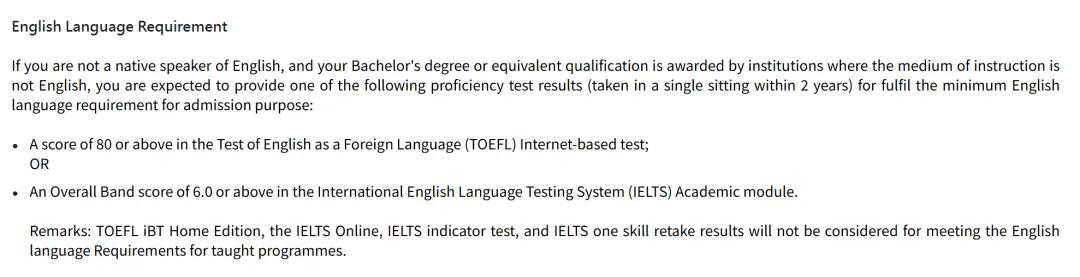 注意:成绩须在录取通知书发出日期前两年内取得,且不接受TOEFL Home Edition或IELTS Indicator。
