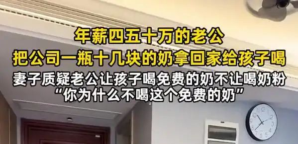近期,一位浙江的妻子委屈的曝光丈夫,大致的内容是年薪50万的丈夫将公司发的福利,也就是每瓶价值十几元的牛奶带回家给孩子喝,却因“免费”标签遭妻子的指责。