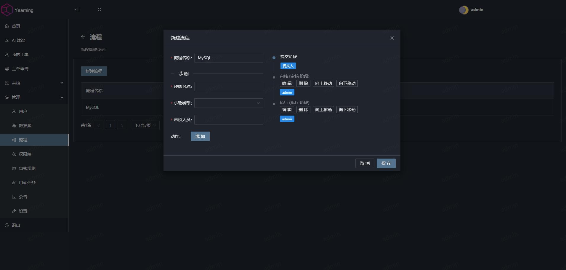 http://{IP/域名}:8000默认账号:admin, 默认密码:Yearning_admin.